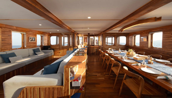Wnętrza łodzi utrzymane są w ciepłych, naturalnych tonach drewna, które tworzą atmosferę luksusu bez zbędnego przepychu — elegancką, a jednocześnie przyjazną i swobodną. Klimatyzowany salon z jadalnią to serce jednostki: miejsce wspólnych posiłków, briefingów nurkowych, rozmów przy winie i spokojnych chwil pomiędzy kolejnymi przygodami.