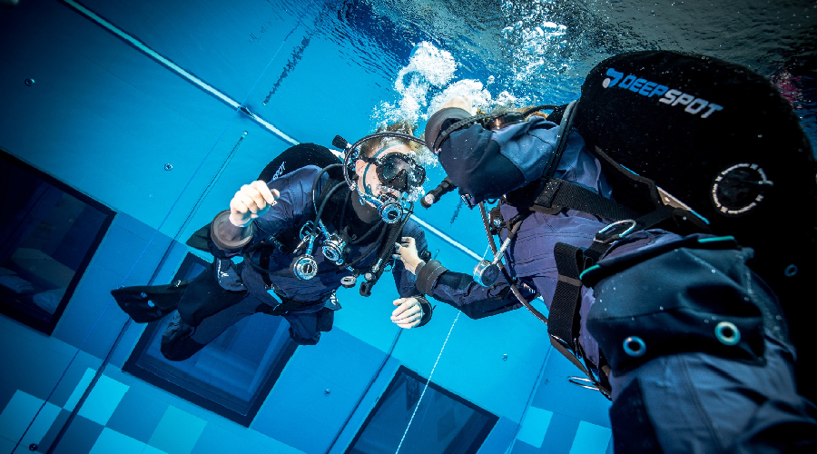Część basenowa kursu składa się z dwóch dni na najgłębszym basenie w Europie - Deepspot w Mszczonowie. Podczas każdego z dni szkoleniowych mamy minimum 3 sesje w wodzie, podczas których wykonując ćwiczenia, nauczysz się umiejętności i procedur potrzebnych, by móc bezpiecznie i z przyjemnością nurkować. Na cały kurs zapewniamy komplet sprzętu, zaś szkolenie odbywa się z użyciem butli dwuzaworowych, automatów w konfiguracji hogarthian, BCD z postaci skrzydła oraz, od drugiego dnia szkoleniowego, suchego skafandra.